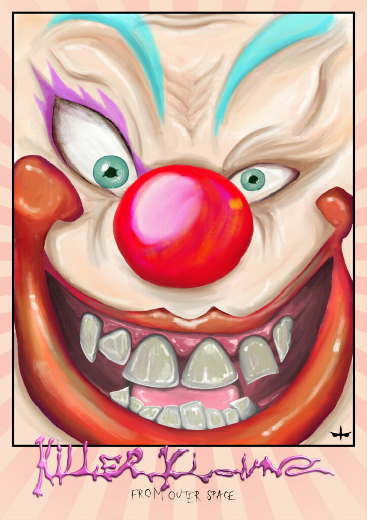 Affiche réalisée d’après le film « Killer Klowns from Outer Space » de Stephen Chiodo (1988). Peinture digitale.