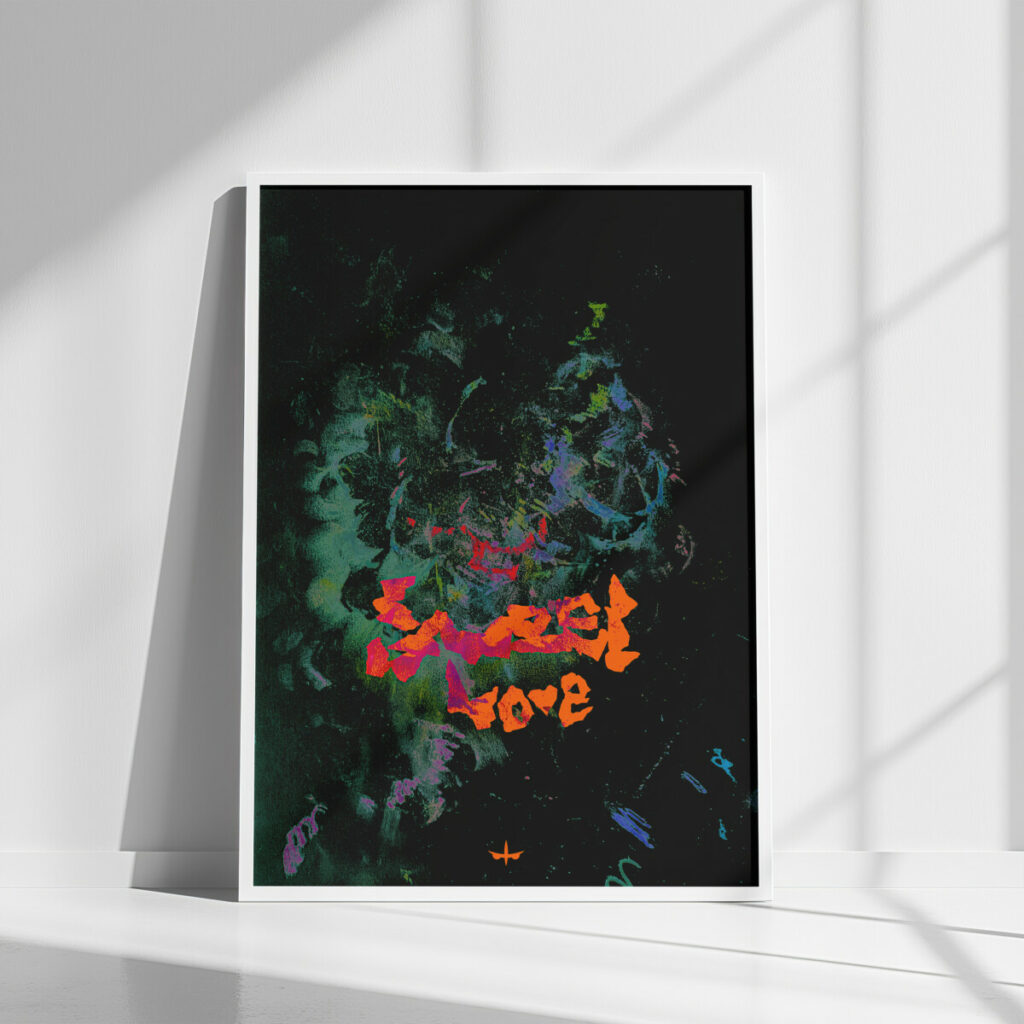 Poster « Sweet Love ». Pastel sur papier, ensemble de papiers déchirés, puis photomontage digital.